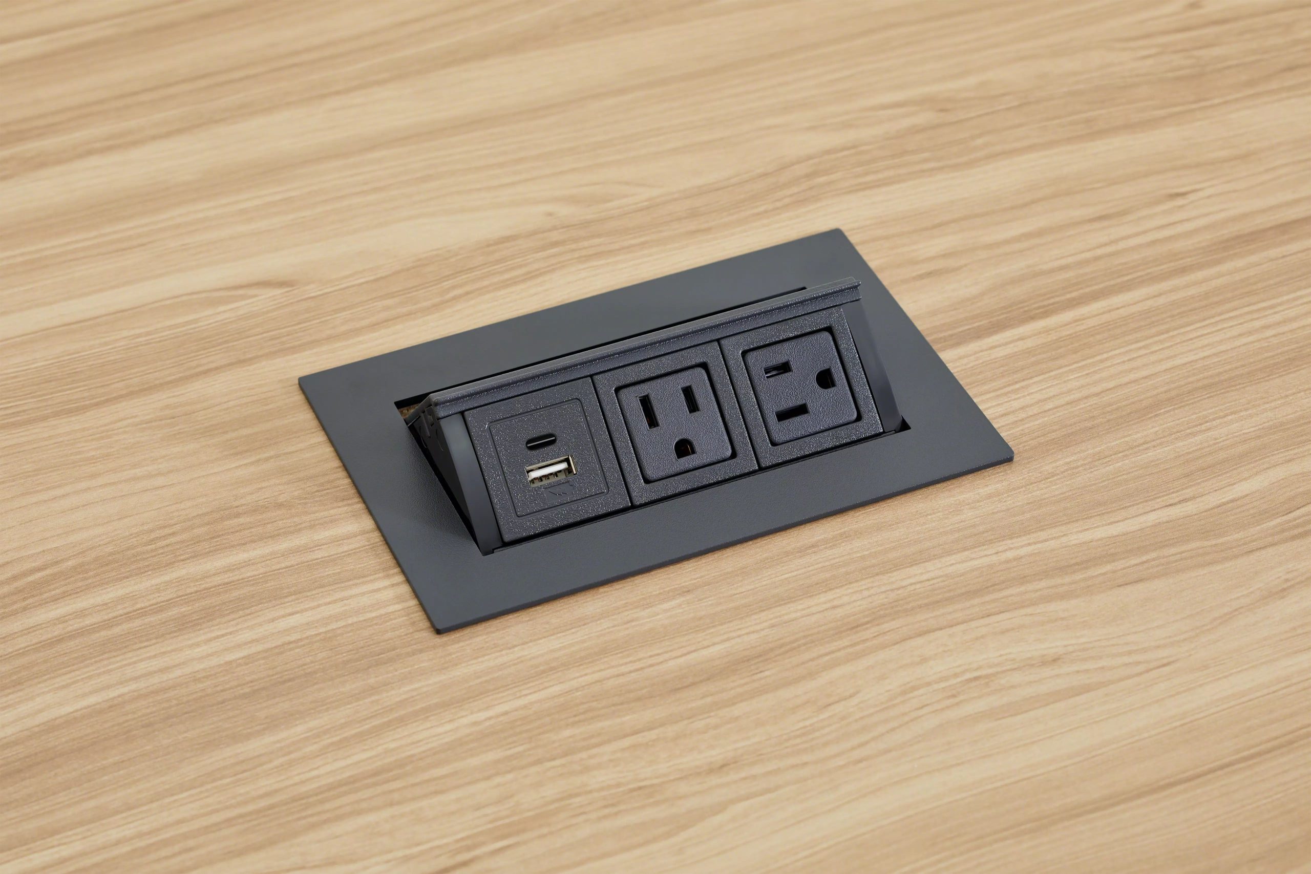- Pop-up design brings power and USB charging right to the worksurface
