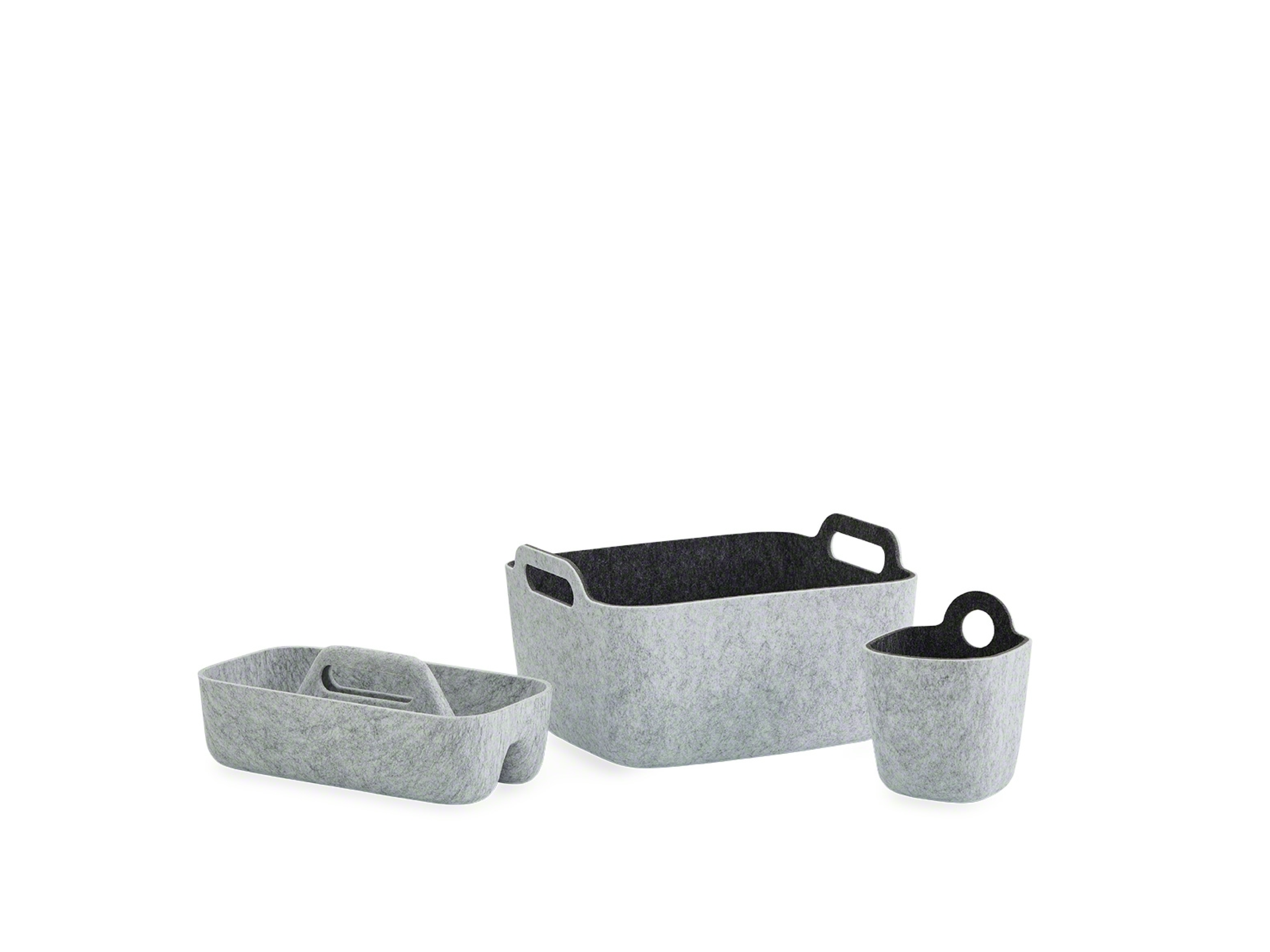 The Flex Accessories range includes baskets and cups constructed of formed and felted PET available in light grey/dark grey or blue/medium grey combinations, with dimensions such as baskets measuring approximately 295 mm × 360 mm × 190 mm and cups sized around 145 mm × 140 mm × 175 mm.