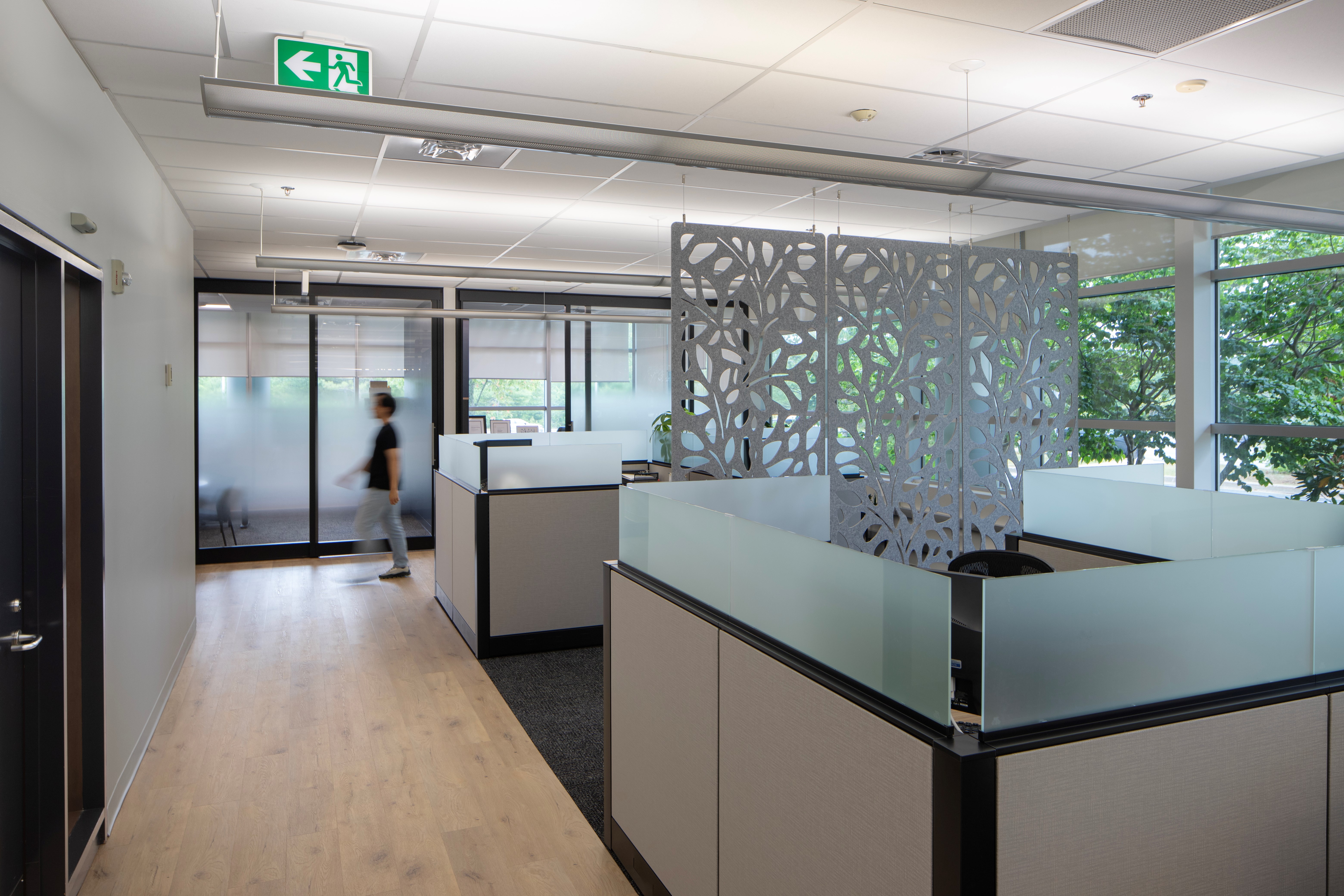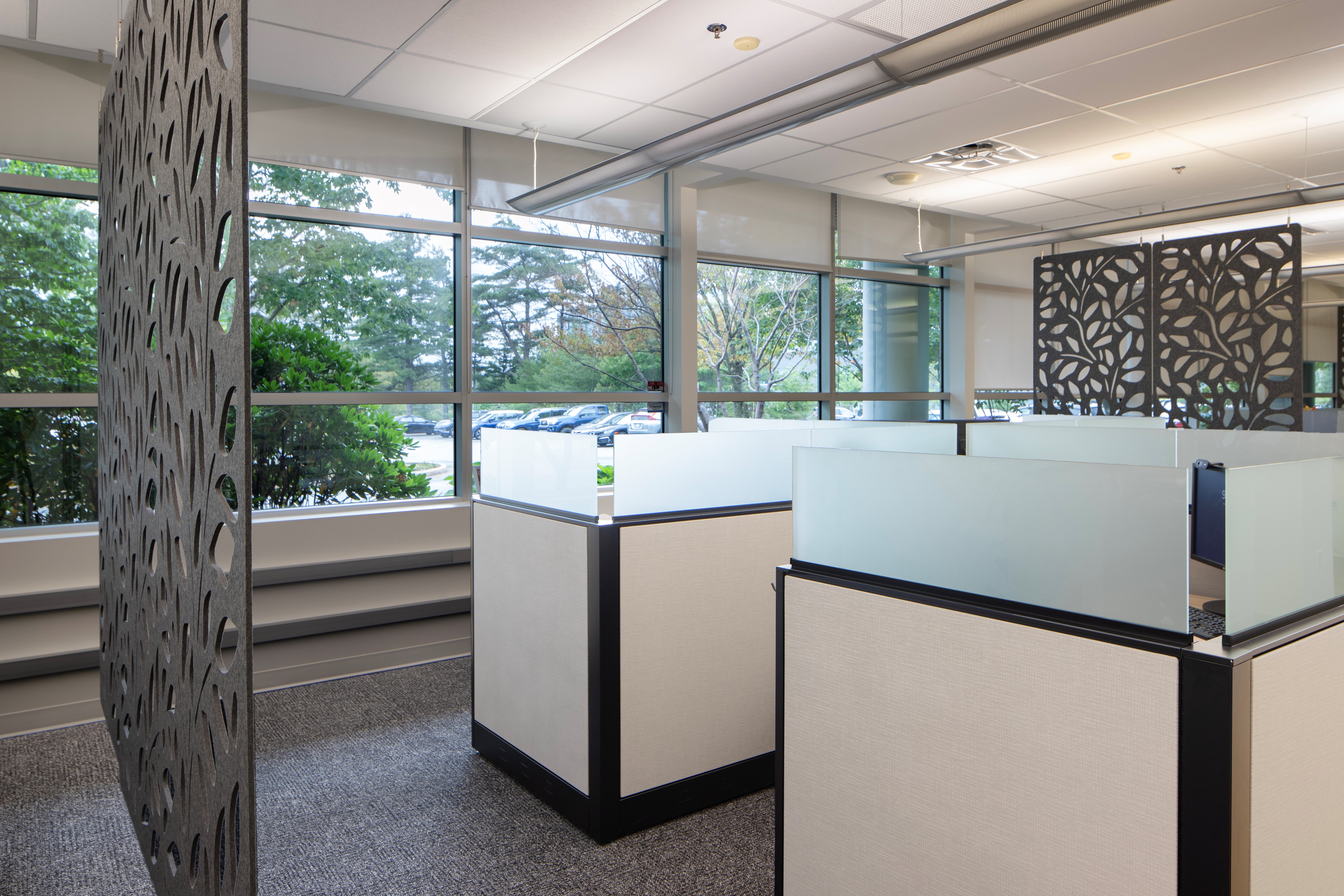 Every design choice reinforced these priorities. Acoustic seals and glass elements worked together to strike the ideal balance between openness and privacy, while finish selections and layout decisions helped maintain a cohesive, visually uplifting environment. Thoughtful integration of hanging acoustic baffles and soft dividers improved sound quality and contributed to a comfortable yet energetic workspace.