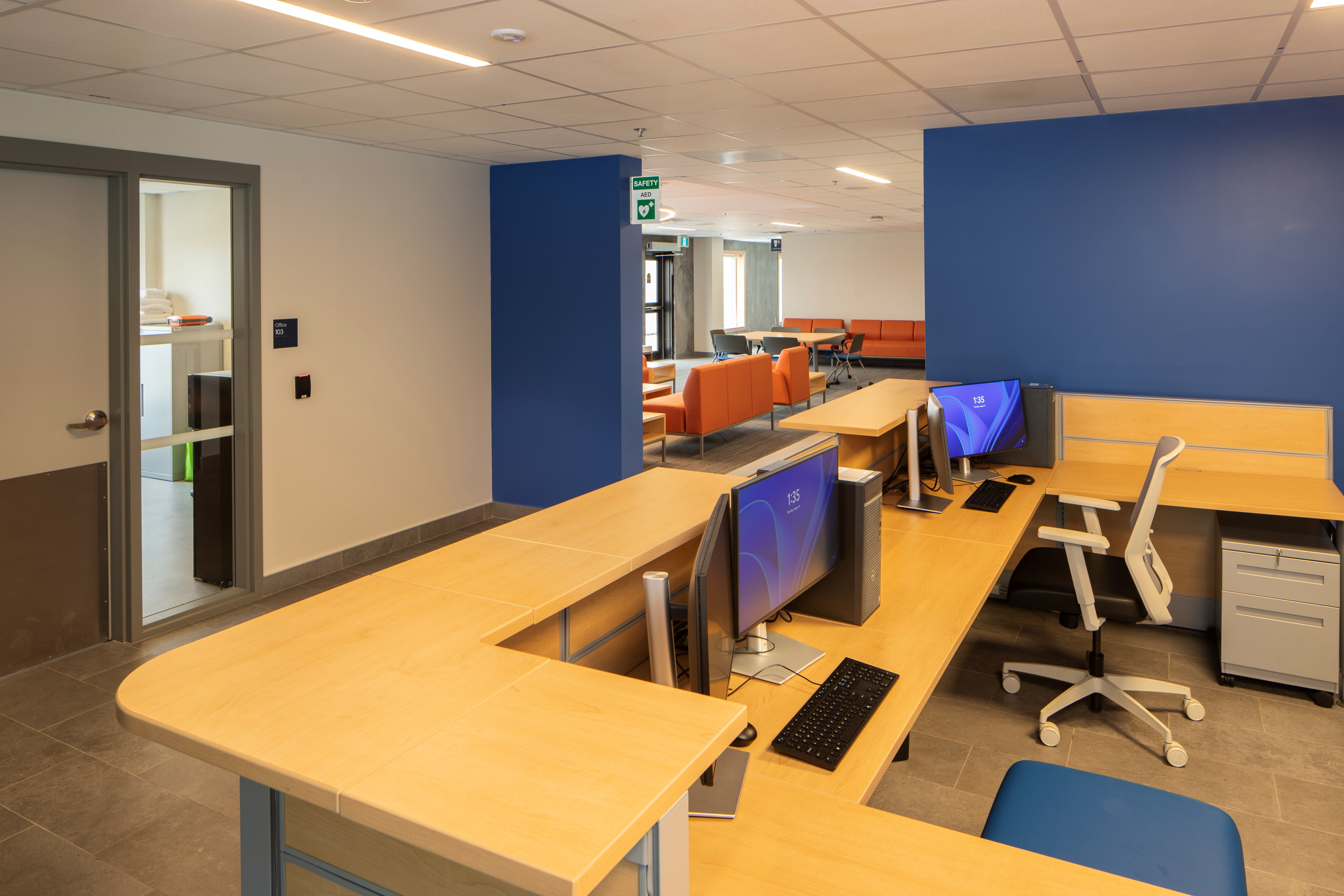 Accessibility was a key consideration, with height-adjustable tables incorporated into barrier-free rooms to support a range of student needs. To ensure the right fit and comfort, furniture samples and prototypes were reviewed during the selection process.