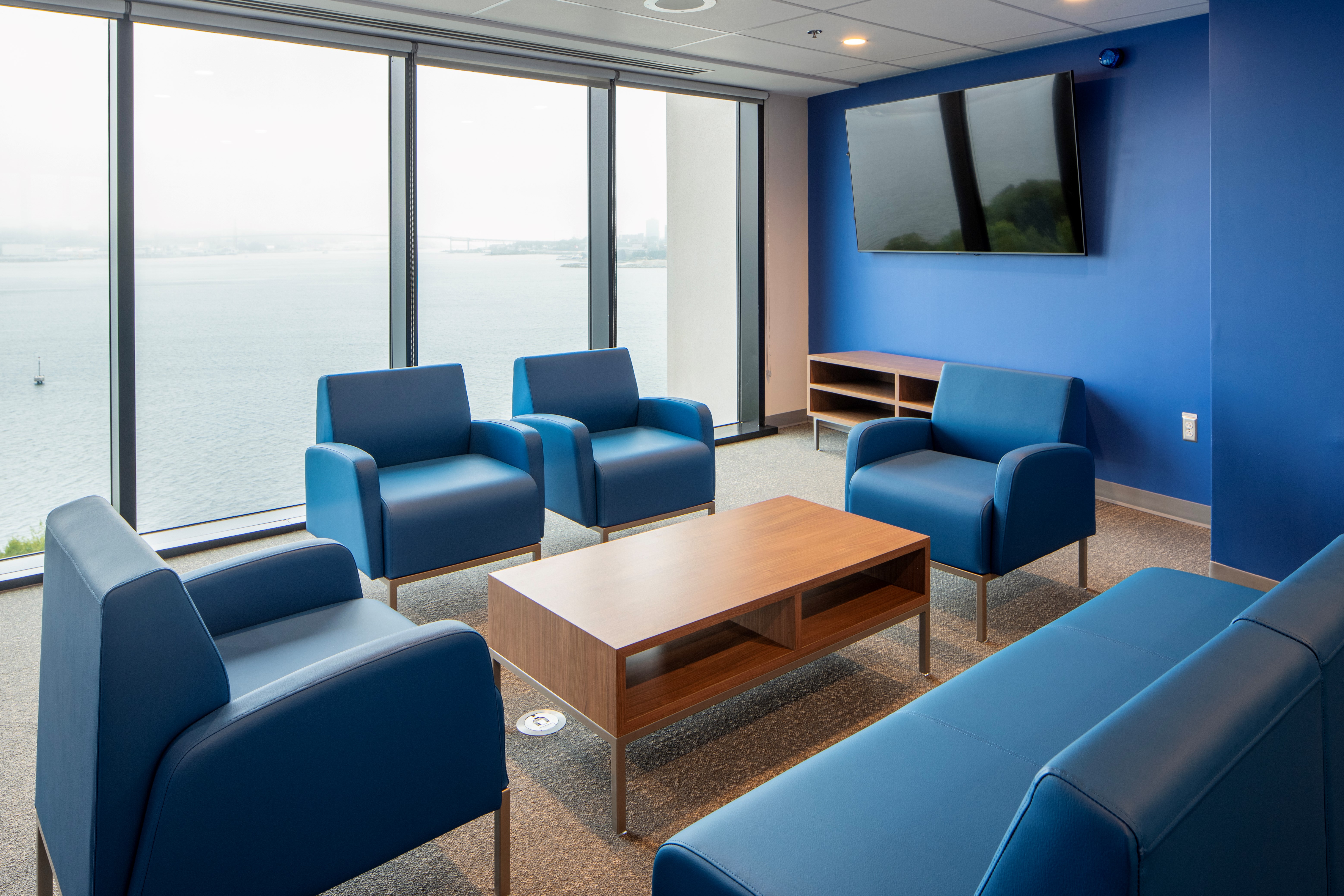 Student rooms were furnished with functional task chairs, side chairs, and versatile tables designed to support everyday study and living needs. Common areas were outfitted with lounge seating selected for comfort, durability, and easy cleaning, including healthcare-grade vinyl finishes well suited for high-use environments.
