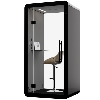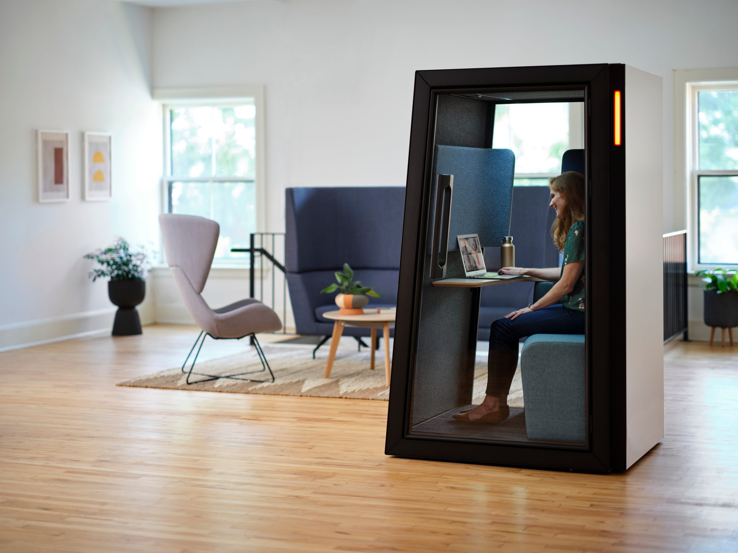 Air³ is a freestanding acoustic pod that combines high-quality glass, soft acoustic paneling, configurable power/data integration, and optional accessories for privacy, collaboration, and speech isolation.