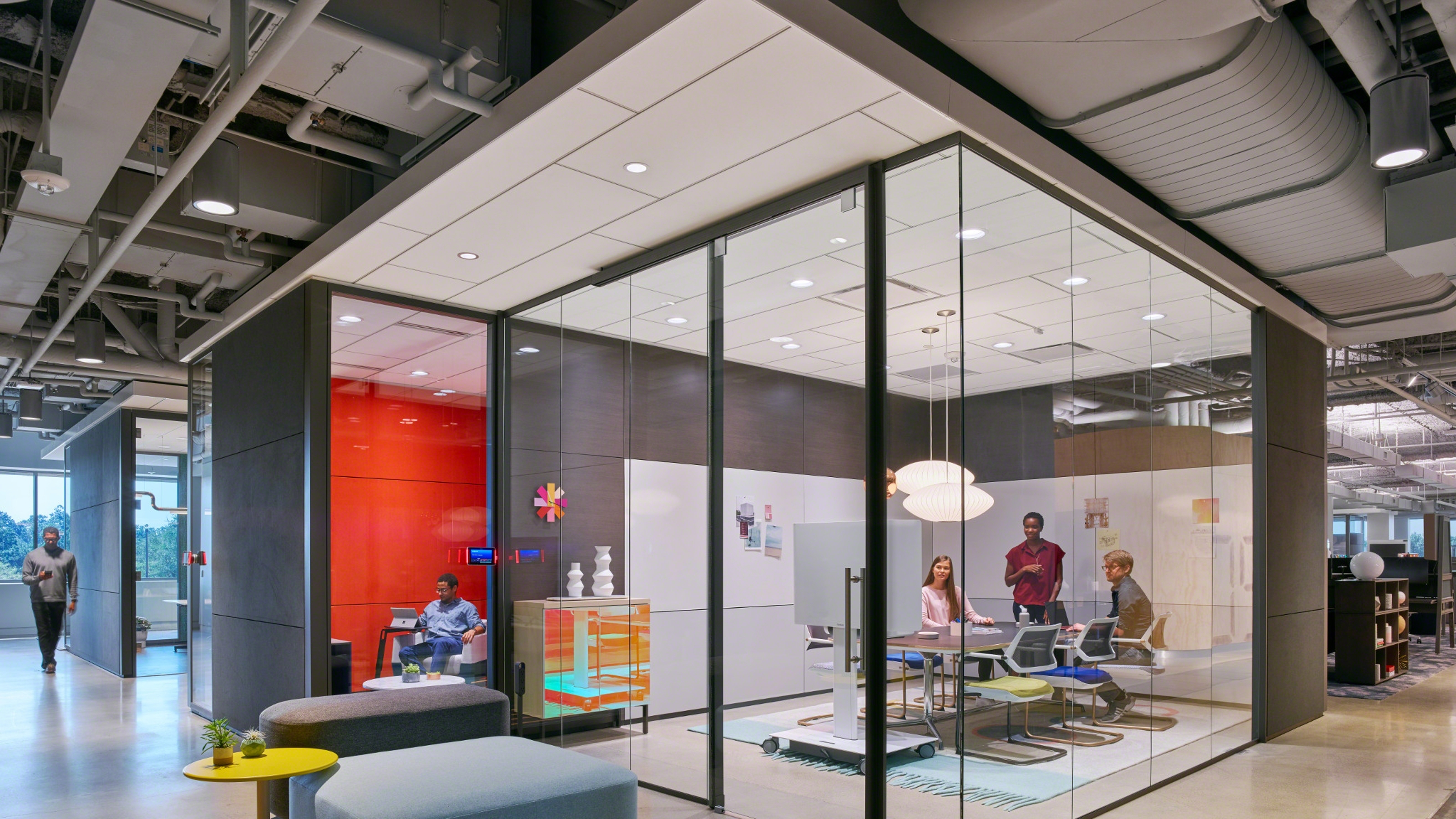 Priva™ acoustic pods combine integrated ventilation and LED lighting, tempered glass entrance door, and optional glass back panel for a comfortable private space within open environments.