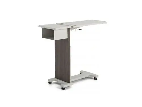 A height-adjustable mobile overbed table that supports patient needs and clinician workflows by providing adaptable, convenient surfaces for meals, care tasks, and collaboration.